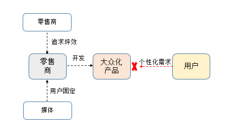 传统零售时代的用户,消费决策受到广告媒体的引导,购买选择也受限于门店陈列商品种类。