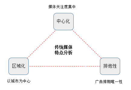 中心化:传统媒体数量相对有限,广告投放由于选择少趋向于中心化