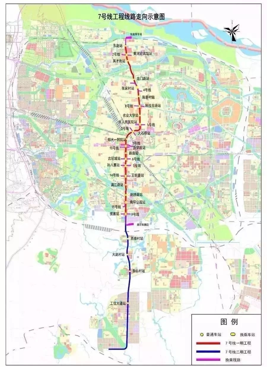 7号线一期自东赵站至侯寨站,线路长 26.9 公里,设车站20 座,从北四环沿文化路、大学路、大学南路走向。