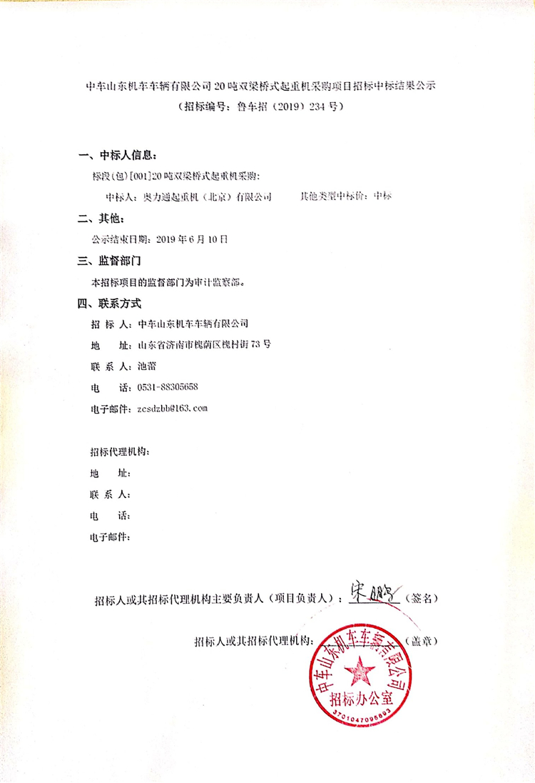 中车山东机车车辆有限公司20吨双梁桥式起重机采购项目招标中标结果公示