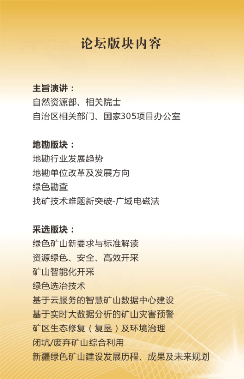 论坛将邀请相关院士,国家发改委、工信部、自然资源部,自治区相关部门及专家学者等发表演讲,内容包括绿色矿山建设及智慧矿山、地质勘查与资源开发、丝路矿业合作及项目推介。吉尔吉斯斯坦、哈萨克斯坦、塔吉克斯坦、乌兹别克斯坦等国矿业管理部门将组团参与,并举行装备引进、资源与产能合作洽谈会。本届博览会及论坛的参会单位将被纳入“中亚矿业合作国际联盟”技术合作库,并作为重点单位优先向新疆及中亚国家相关部门、企业等推荐合作。