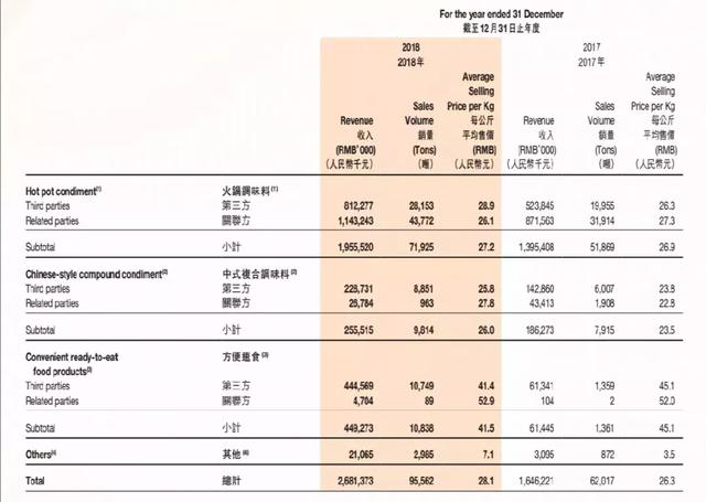 颐海国际是一家主营火锅底料和火锅调味料的企业,公司前身是专门为海底捞门店提供火锅底料的集团子公司,2013年拆分独立,2016年香港上市。公司目前收入分为两大块:2B和2C业务,两者各占50%,其中2B主要是与关联方海底捞合作,2C业务主要以“海底捞”品牌销售火锅底料和蘸料、中式复合调味料和自热小火锅等产品。从其公布的2018年报来看,火锅料是其核心业务,占收入比72.9%。