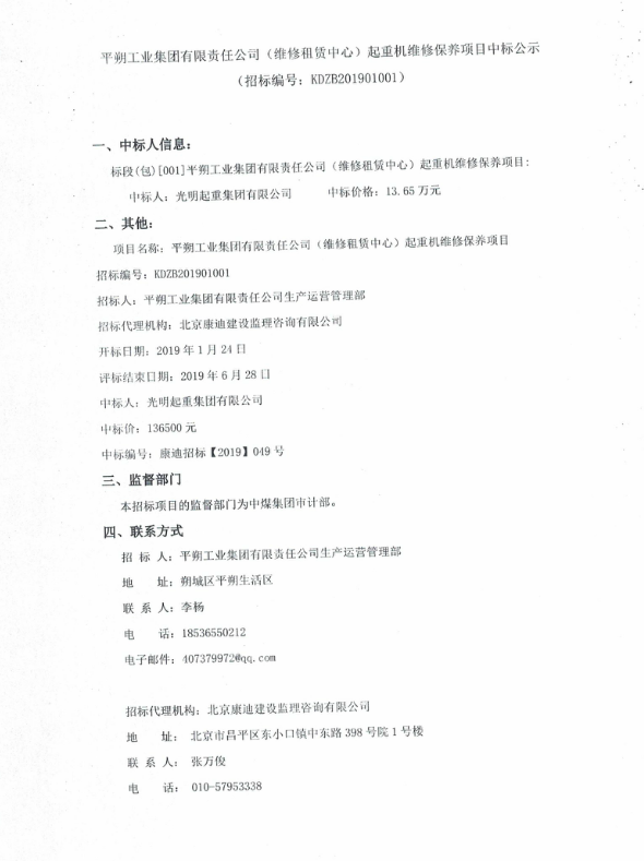 平朔工业集团有限责任公司(维修租赁中心)起重机维修保养项目中标公示