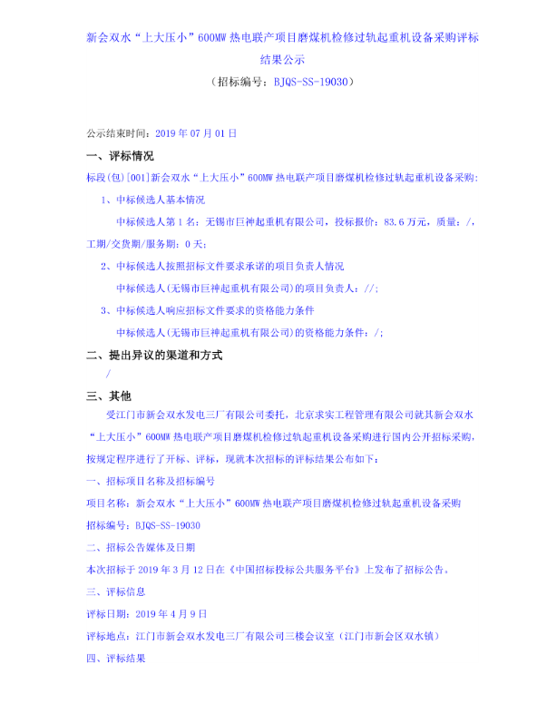 新会双水“上大压小”600MW热电联产项目磨煤机检修过轨起重机设备采购评标结果公示