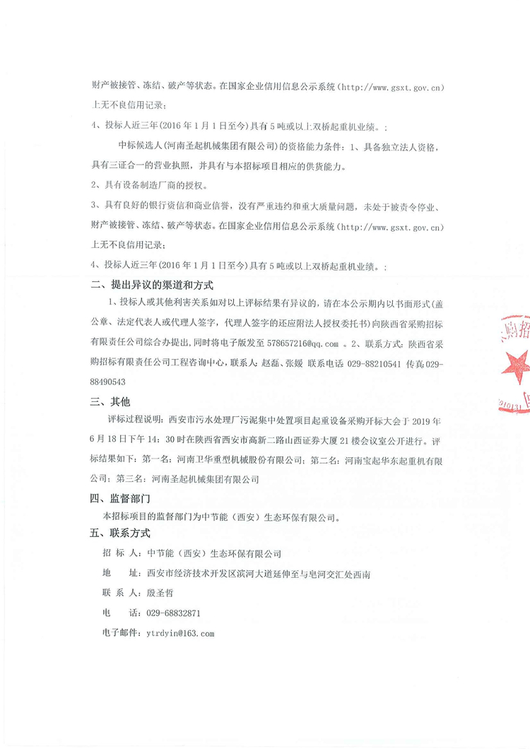 移动版:西安市污水处理厂污泥集中处置项目起重设备采购中标候选人公示