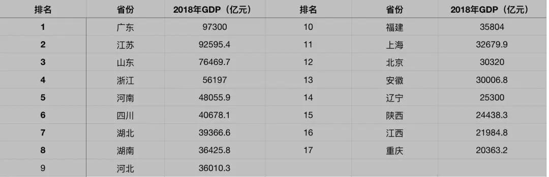 据数据显示,2018年全国GDP十强省份分别为:广东(9.73万亿)、江苏(9.26万亿)、山东(7.65万亿)、浙江(5.62万亿)、河南(4.8万亿)、四川(4.07万亿)、湖北(3.94万亿)、湖南(3.64万亿)、河北(3.6万亿)、福建(3.58万亿)。而这些省市大多属于中国的一二线城市群。