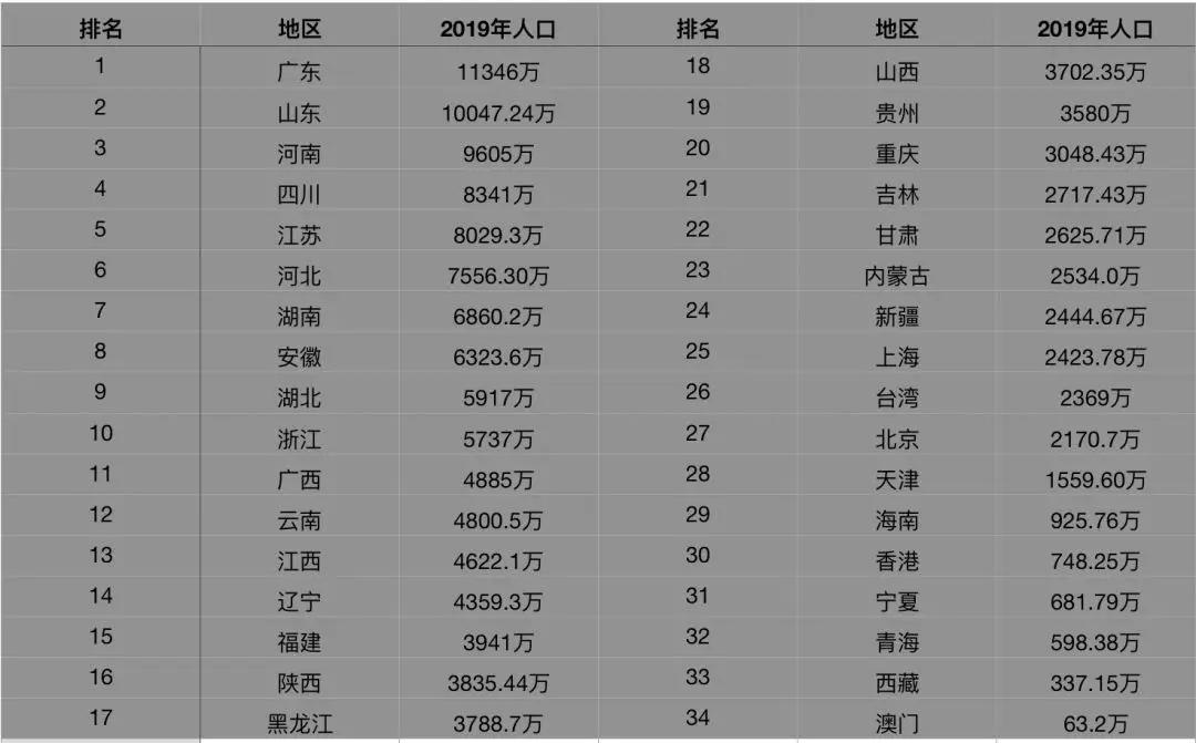 2019全国各省人口排名