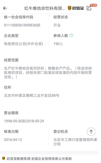 在国家企业信用信息公示系统的记录显示,2018年9月29日是红牛维他命饮料有限公司营业期限届满的日子。