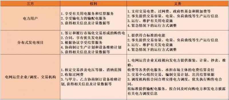 此外,三方协议及交易平台同样是分布式发电市场化交易中的要点。三方协议需购电方(电力用户)、发电方(分布式发电项目)、输电方(电网运营企业)共同明确易模式、交易电量、交易期限,交易价格、计量、结算,以及三方权利与义务等内容。三方具体权利及义务如下表所示: