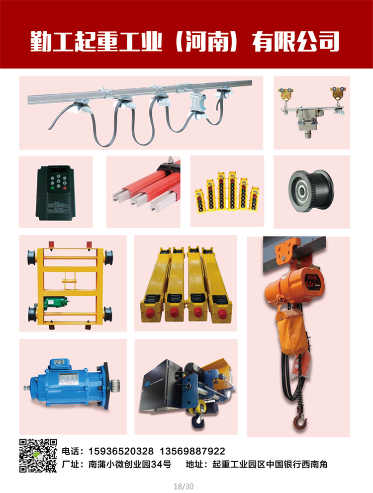 勤工起重主营C型钢,环链葫芦,变频器,三合一电机,台车,滑线等起重配件,产品每年不断出口,走出国门,受到国外客户的好评并保持长期合作。采购热线:15936520328孙经理