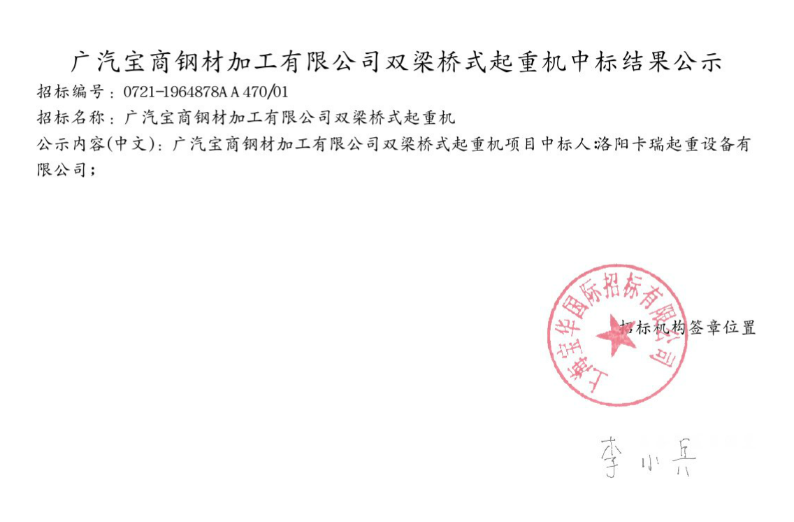 移动版:广汽宝商钢材加工有限公司双梁桥式起重机中标结果公示