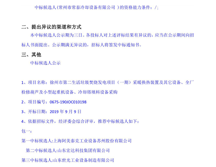 移动版:徐州市第二生活垃圾焚烧发电项目(一期)采暖换热装置及其它设备、全厂检修葫芦及小型起重机设备、冷却塔填料设备采购中标候选人公示