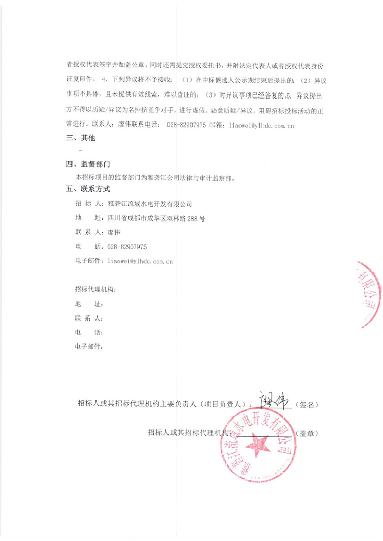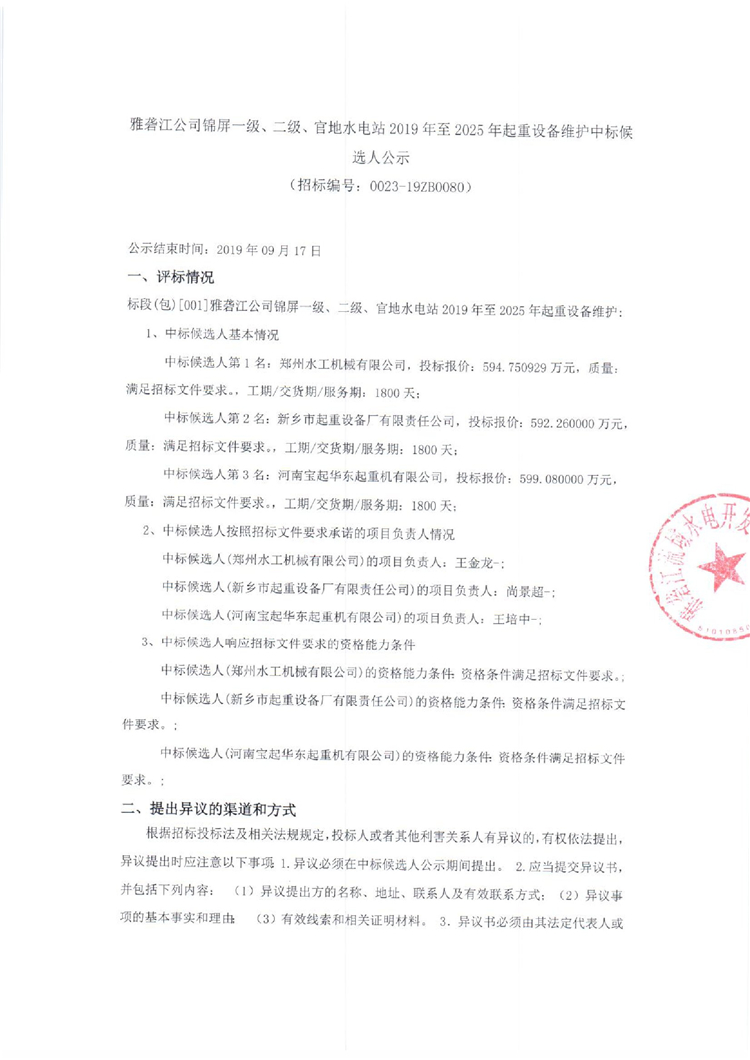 雅砻江公司锦屏一级、二级、官地水电站2019年至2025年起重设备维护中标候选人公示