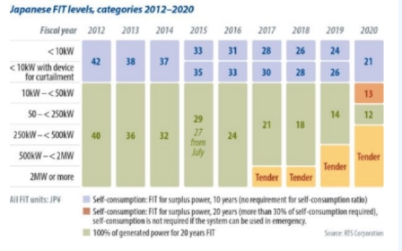 自2020年4月也就是日本最新财政年度的第一个月开始,新的上网电价政策开始生效:其中关键的变化是新政策的费率和对规模从10 kW到50 kW的光伏系统的自我消耗要求,以及参加投标的项目容量下限从之前的500 kW降低到了250 kW。