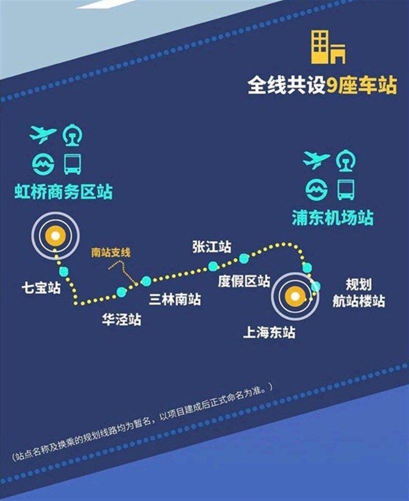 按照设计,机场联络线从虹桥枢纽站出发经过沪杭铁路外环线、七宝、华泾、三林、张江、迪士尼、浦东国际机场等重要地区,最后达到上海东站,沿线设站9座。