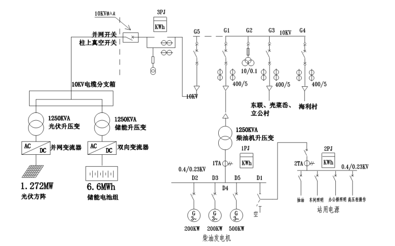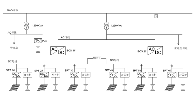 光伏系统(1.274MWp)与储能系统(7.239MWh)总直流母线连接,并由2台BCS逆变器升至400Vac交流母线,并经0.4/10.5kV升压变升压至10kV输电线路接入用户侧。
