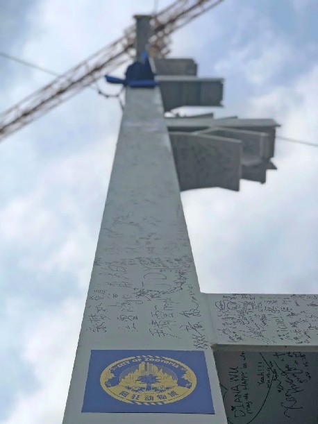图为上海迪士尼度假区、上海国际旅游度假区管委会、上海申迪(集团)有限公司、华特迪士尼幻想工程员工在首根钢结构柱上签名留念。新华网 发