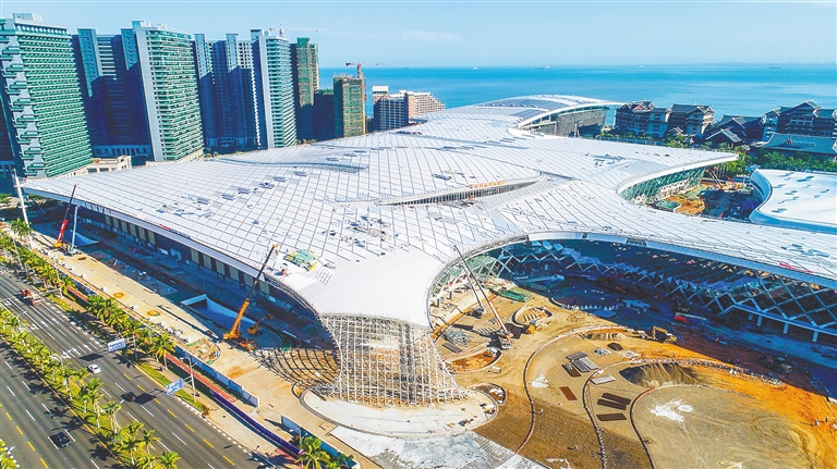 6月12日,航拍正在加紧建设中的海南国际会展中心二期项目。目前,海南国际会展中心二期项目外立面幕墙装饰以及内部装修均已进入收尾阶段,预计6月底全面完工。