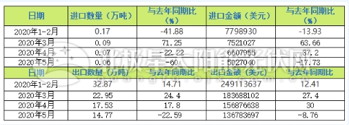 据海关数据显示,2020年5月份我国光伏玻璃出口数量为14.77万吨,同比22.59%,出口金额为1.36亿美元,同比减少8.76%。5月,光伏玻璃进口数量为0.06万吨,同比下滑60%,进口金额为502.7万美元,同比减少17.73%,光伏玻璃进出口数据双方向持续低迷。