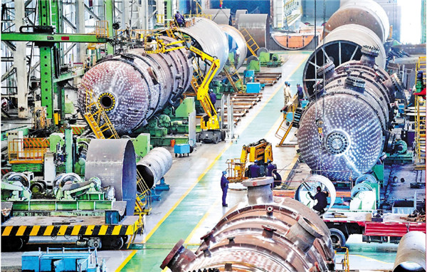 哈电锅炉内蒙古汇能煤化二期项目四喷嘴水煤浆气化炉生产现场。(资料片)