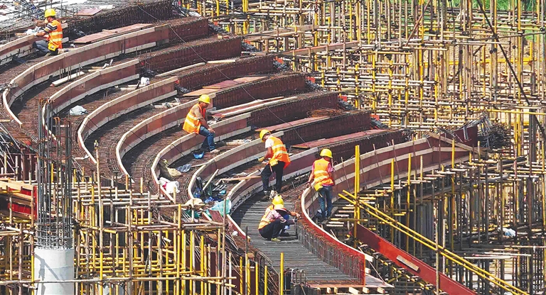 7月8日,在儋州市体育中心“一场两馆”项目建设现场,体育场和体育馆正在进行主体结构施工建设,游泳馆仍处于基础施工阶段,工程车辆来往穿梭,工人正忙着施工。