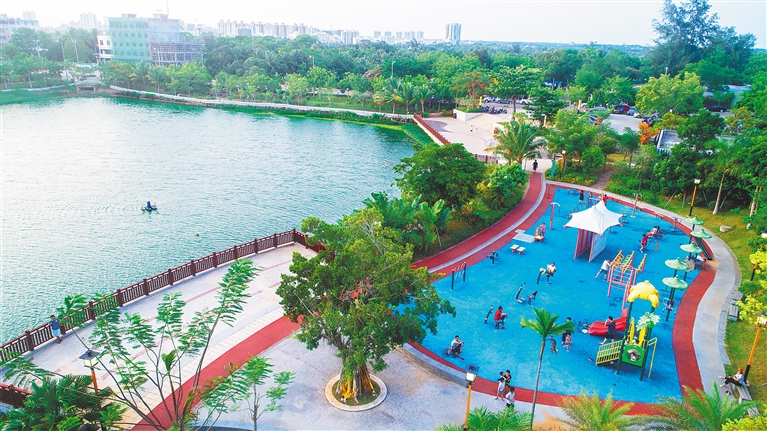7月9日,文昌市文城镇霞洞湖公园,不少市民在公园漫步,享受美好时光。