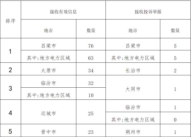 各地市按照收到的有效信息数量排序,吕梁市、太原市、临汾市、运城市、晋中市等列辖区内前5位;按照投诉举报数量排序,吕梁市、长治市、大同市、临汾市、朔州市等排在辖区内前5位。(2020年6月有效信息及投诉举报排名前5位情况见表三)