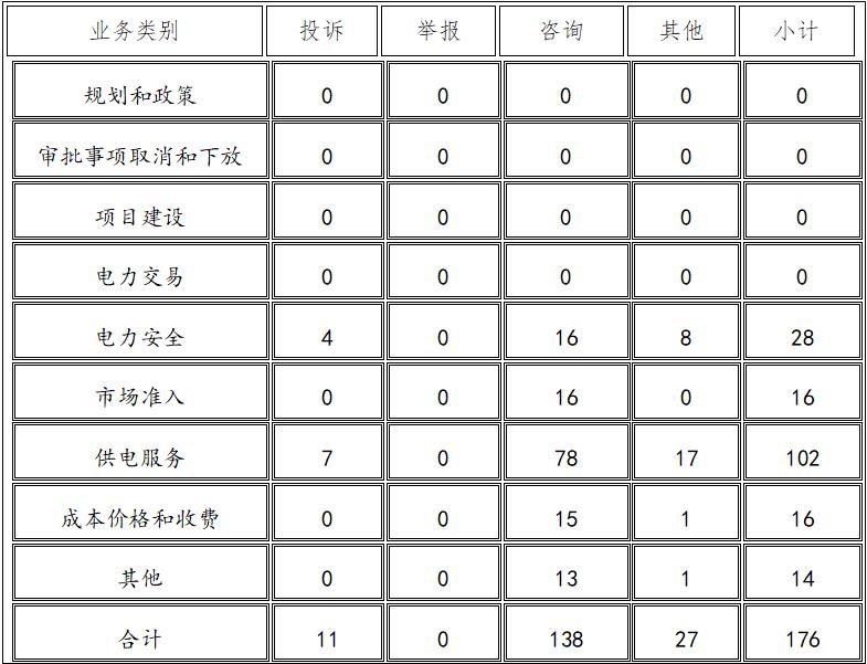电力行业排在首位,有效信息数量为176件,占全部有效信息的65.19%;其中受理的投诉举报数量5件,占全部投诉举报数量的41.67%。群众反映问题主要集中在供电服务、停电抢险、电力安全等方面。(2020年6月电力行业有效信息按业务分类情况见表二)