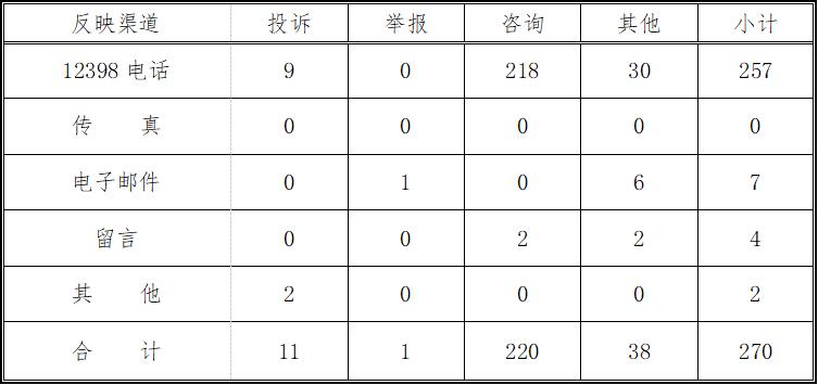 按反映渠道分类,12398电话257件,电子邮件7件,留言4件,其他2件。(2020年6月收到有效信息情况见表一)