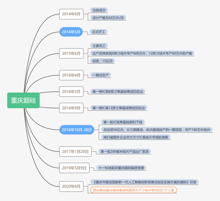 2014年5月,重庆超硅投资建设的“极大规模集成电路用300mm(含200mm)单晶硅晶体生长与抛光硅片及延伸产品”项目正式开工。
