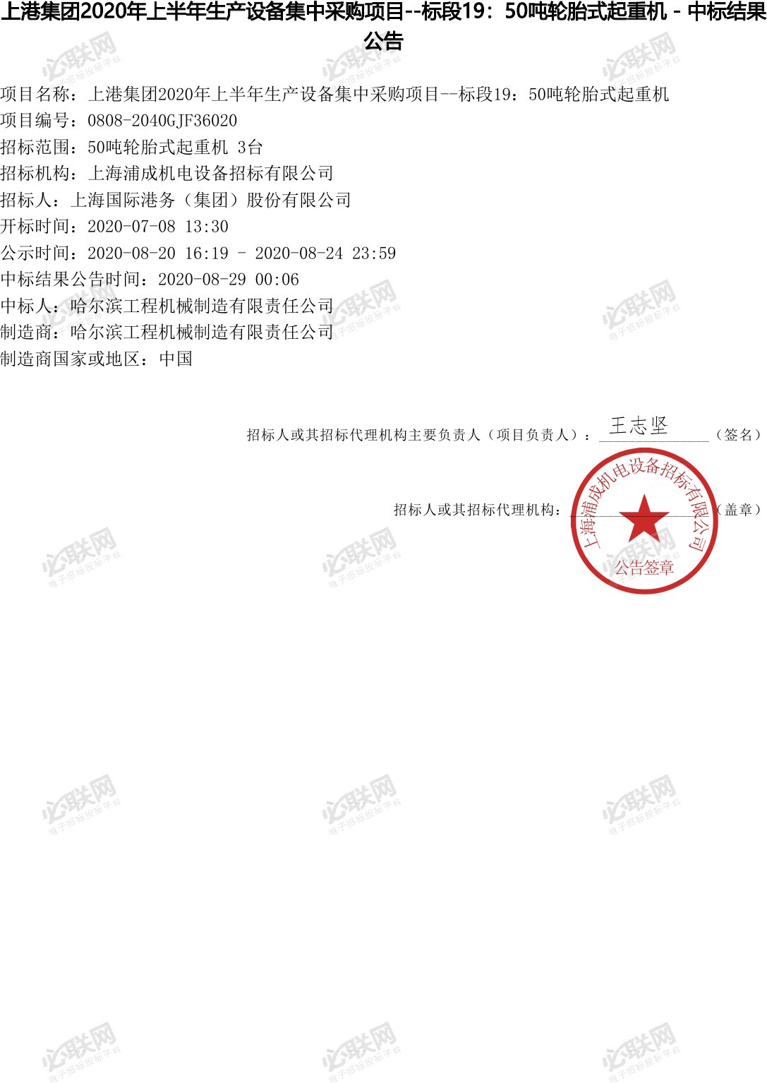 移动版:上港集团2020年上半年生产设备集中采购项目--标段19:50吨轮胎式起重机中标结果公告(1)