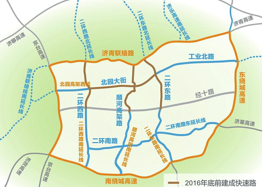 1997年,济南第一条城市高架——顺河快速路开建。截至2016年底,济南共建成顺河、北园、二环东、二环西、二环南等共计53公里的城市快速路。