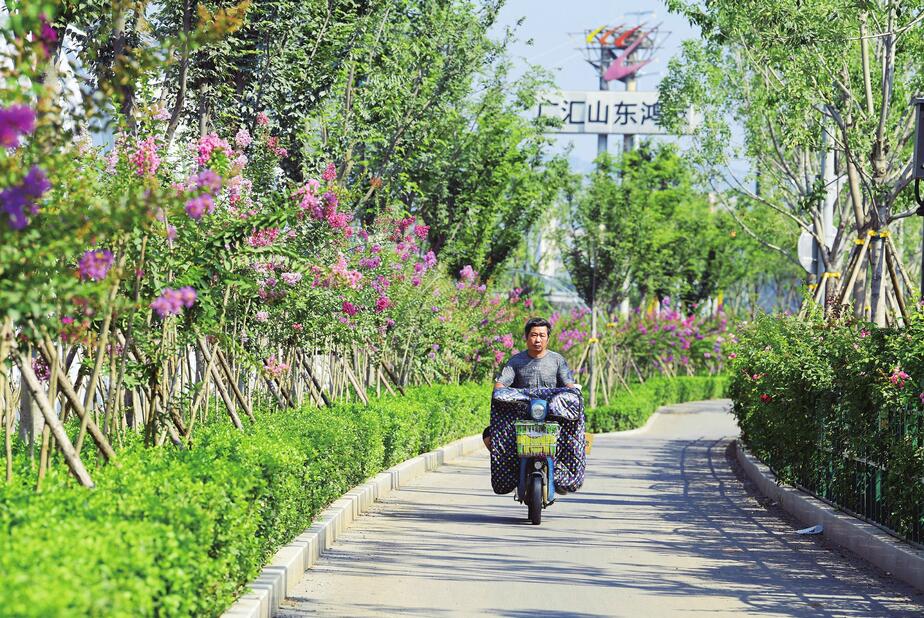 顺河快速路南延两侧绿树成荫,绿化效果层次分明。 (崔健摄)