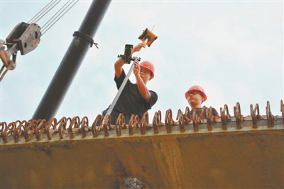 昨日,由中国铁建大桥工程局集团有限公司承建的番海大桥施工现场车声隆隆,一片繁忙景象,随着吊车挂钩的摘取,项目首片箱梁成功架设,标志着大桥全面进入桥面系及附属施工阶段,向实现大桥合龙以及年底主线通车的目标迈出了坚实的一步。