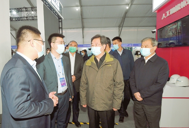 十月三十一日,二○二○中国(太原)人工智能大会开幕式前,省委书记楼阳生等省领导与参会嘉宾一同巡馆,参观人工智能主题展览。记者李联军摄