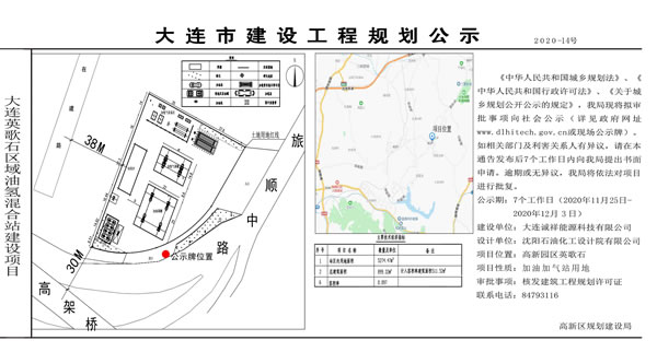 11月25日,高新区规划建设局公示了大连英歌石区域油氢混合站建设项目规划,该项目位于旅顺中路英歌石区域,建设单位是大连诚祥能源科技有限公司,设计单位是沈阳石油化工设计院有限公司,项目性质为加油加气站用地。站区内用地面积为5274.47平方米,总建筑面积为899.32平方米,计入容积率建筑面积为511.52平方米,容积率为0.097。车站内分别建有一处加氢气罩棚和一处加油罩棚。