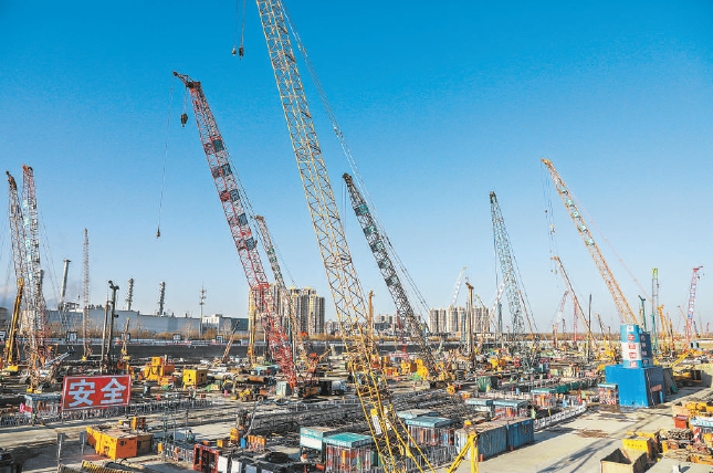 城市副中心站综合交通枢纽施工现场塔吊林立、机器轰鸣,一派热火朝天的建设景象。