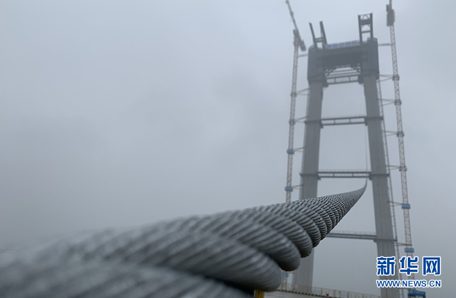 2020年10月21日,紧缆机对伍家岗长江大桥进行紧缆施工。新华网发 新华网发 雷伟利摄