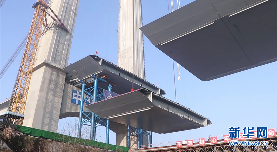 2020年12月8日,宜昌伍家岗长江大桥启动首榀钢箱梁吊装。新华网发 雷伟利摄