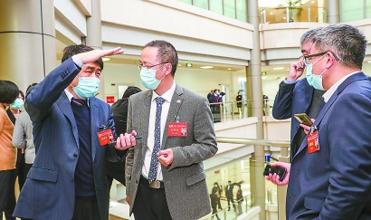 昨天,王如路委员(左一)在分组会议间隙,向多位委员介绍,随着15号线的投入运营,上海轨道交通总运营公里数达到772公里,成为世界上运营里程最长的轨道交通城市。记者 张海峰 摄