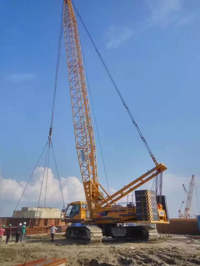 大桥崛起,重器为盾。跟随项目组最先进场的是6台徐工履带起重机,克服孟加拉湿热多雨的作业环境,即使身陷“泥塘”,也能轻松自如,一路前行如履平地,展现超强的“涉水”能力,高效地完成了混凝土梁、钢筋笼等吊装任务。