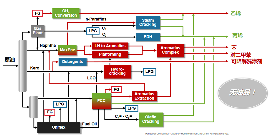 当然,还有不得不提的分子炼油技术,它能够最大程度地利用原油。比如霍尼韦尔UOP的MaxEne,可以把直链和异构的石脑油分离出来,分别用来生产烯烃和芳烃,同时提高烯烃和芳烃的产率。如果炼厂不需要芳烃,则可以通过逆向异构化把异构烷烃转化成直链烷烃,从而为烯烃裂解装置提供更多的优质原料,提高产率。升级的方法不一而足,霍尼韦尔UOP可以给炼厂进行初步评估来探讨炼厂升级的机会,根据装置的规模和设备的极限提供最省钱和高效的改造建议。