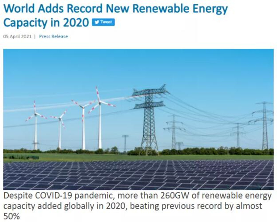 据国际可再生能源机构(IRENA)刚刚发布的《 2021 年可再生能源统计》,虽然发生了 COVID-19 疫情,2020年全世界增加了超过 260 吉瓦(GW)的可再生能源装机容量,比 2019年的增长量增加了近 50%,新增可再生能源装机容量创历史新高。