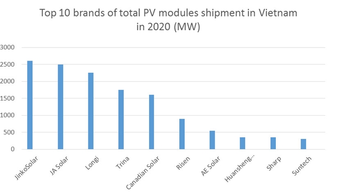 越南MOIT与Clean Energy Associate官方媒体Vietnam Energy Online近日发布2020年越南组件出货量市场报告,数据统计显示,晶科能源以超过2.5GW的销量,连续第三年稳居越南市占第一。晶澳,隆基分列第二、第三,阿特斯,东方日升,新源,东方环晟,夏普,尚德紧随其后。