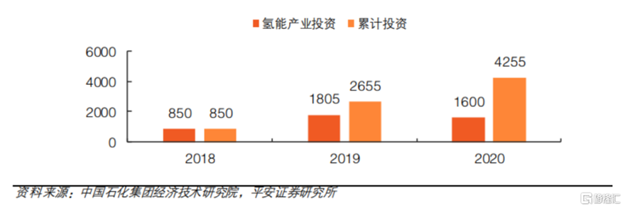同时,近几年,氢能产业的投资规模在持续增长,疫情也并未对此积极局面产生影响。根据公开信息初步统计,2019年氢燃料电池产业相关投资及规划资金1805亿元。尽管受到疫情影响,2020年氢能产业整体发展速度有所放缓,但在投资方面,投资金额 1600 亿元,仅有11%左右的降幅,显示了市场对于氢能产业依旧充满信心。