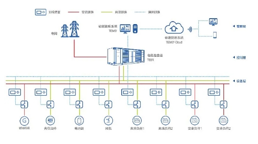 基于电力电子变压器的交直流混合微网系统总体可分为三层架构。第一层为设备层,主要囊括了分布式电源(风电、光伏系统等)和不同的交直流负荷;第二层控制层,以电力电子变压器为核心,分布式电源和负荷可通过其灵活的多端口配置实现可靠接入,并通过其中/高压接口,实现与配电网的有效连接;第三层为管理层,以“双端”能量管理系统为核心,采用人工智能算法可实现电力电子变压器交直流混合系统的分布式能源互补优化以及多个端口之间的协调控制,提高能源利用效率,多机并联系统的集群控制、功率在线优化分配,保障系统效率最优,同时能够对接电网调度,参与电力市场交易及辅助服务等,真正实现绿色数据中心电能的智能路由。