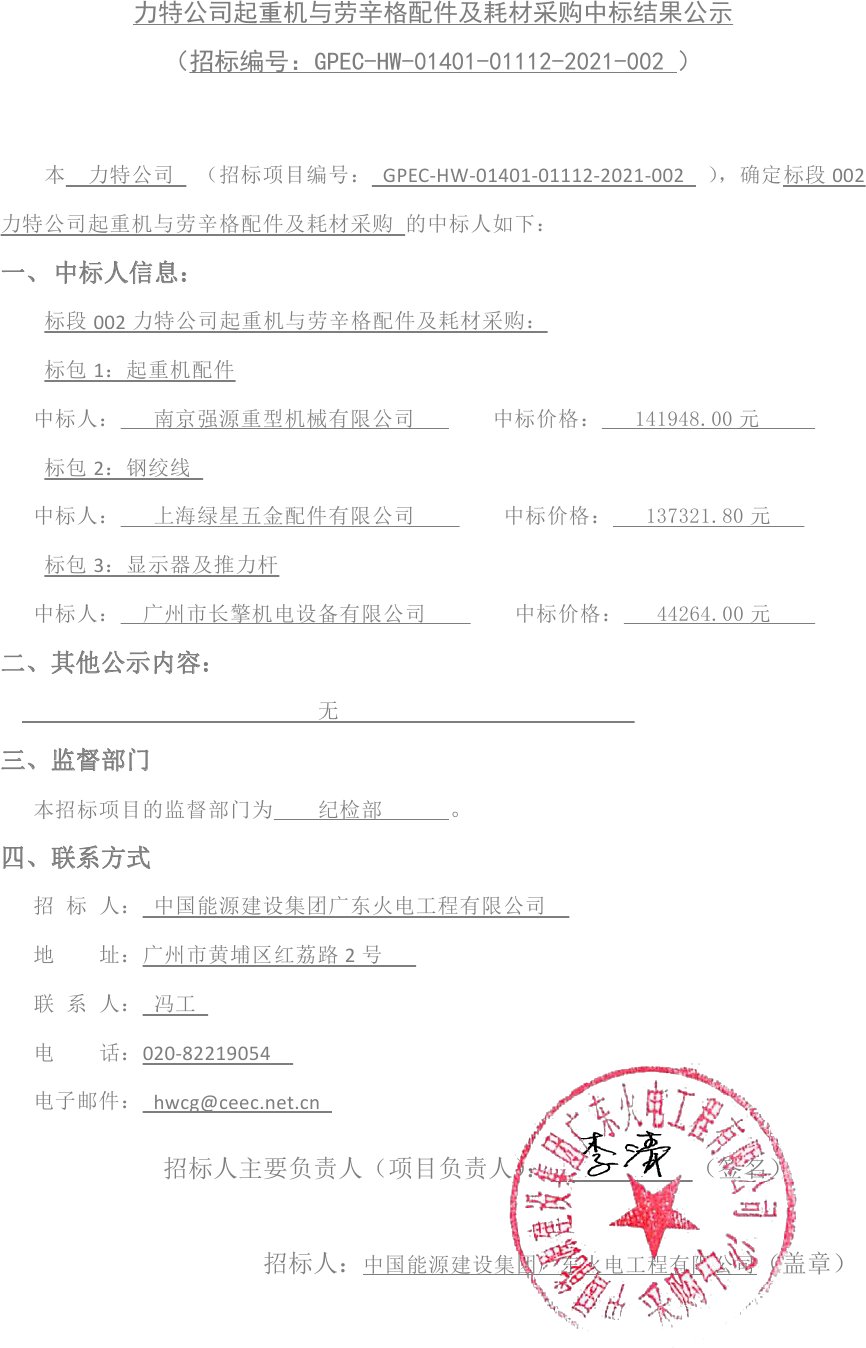 移动版:广东:力特公司起重机与劳辛格配件及耗材采购中标结果公示