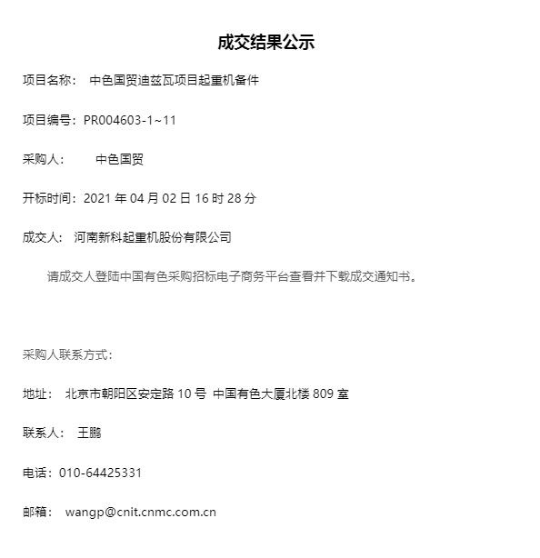 移动版:北京:中色国贸迪兹瓦项目起重机备件成交公示