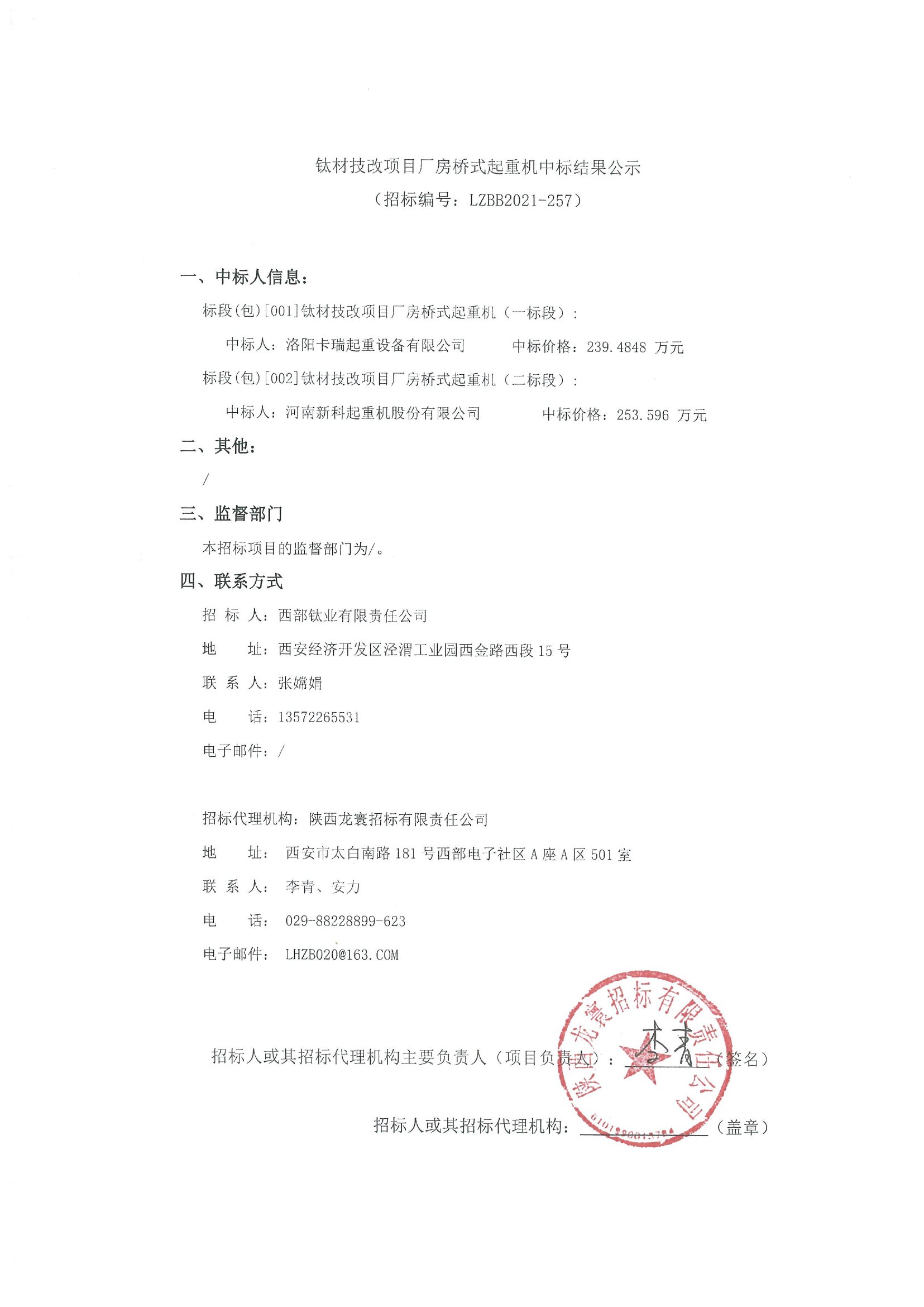 移动版:陕西:钛材技改项目厂房桥式起重机中标结果公示