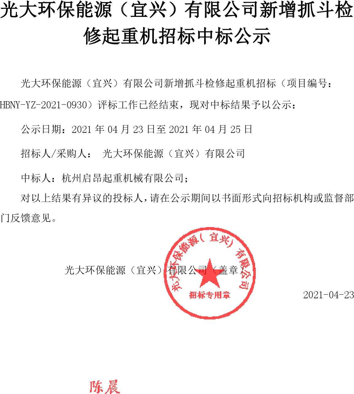 移动版:江苏:光大环保能源(宜兴)有限公司新增抓斗检修起重机招标中标结果公示